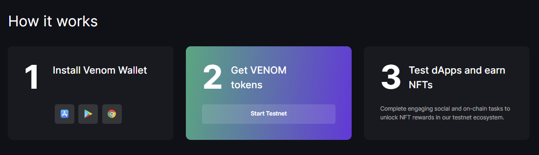 Venom is currently a TESTNET project. This means they’re running a trial version of the blockchain with fake tokens. Anyone can get these testnet tokens for free, and test out the blockchain and its Dapps.